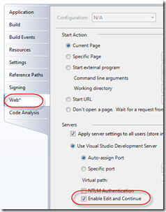 Although I think the performance hit is not as big to let go of not using the feature... I would recommend that you go and try it out by checking the Edit & Continue checkbox in your Web section of Property Pages as below: