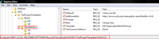 Also one point to note over here is that VS Test Framework selection system will create a test project for the same language as your primary MVC Application Project. The same registry strings that we just discussed above can be replicated at the top node (e.g. 'VisualStudio') that I have highlighted in the Fig 2 above. I would recommend having that replicated as it allows Visual Studio to fall back on this template in case your primary MVC Application is of languages like 'IronPython' etc. In nutshell that is the default template for that particular test framework within VS.