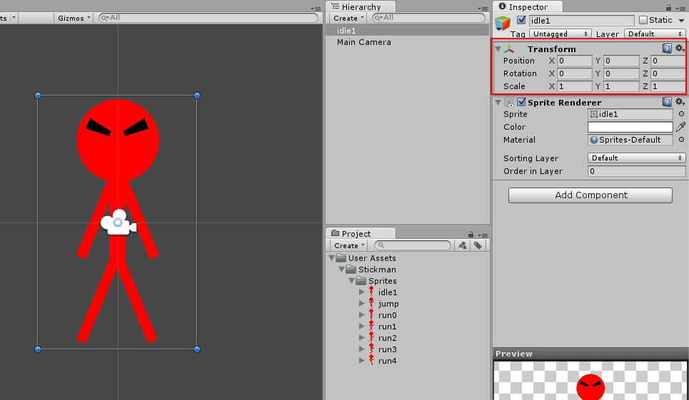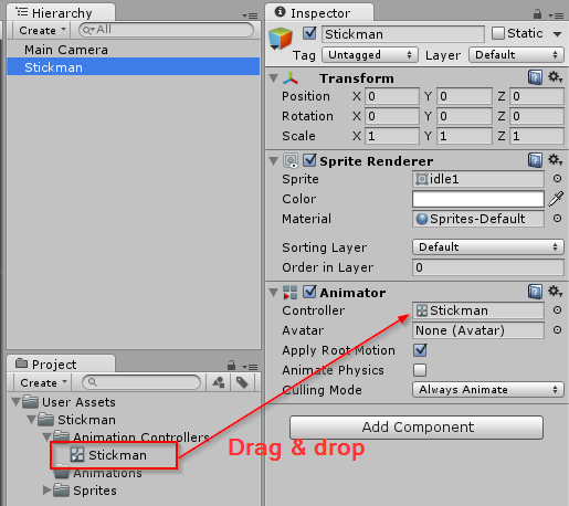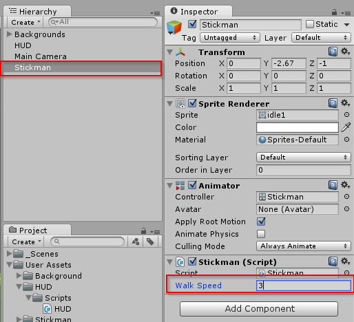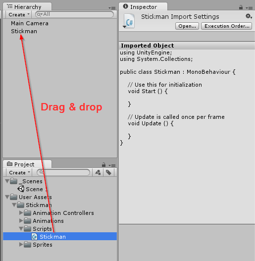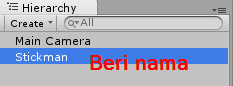 Buat script Stickman.cs dan letakkan pada sprite Stickman di hierarchy dengan cara drag & drop