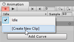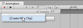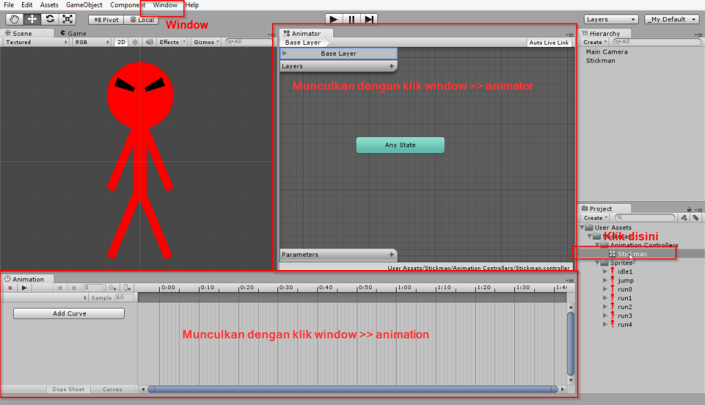 Animasi Idle ini nanti akan kita mainkan ketika karakter stickman dalam keadaan diam, tidak berjalan, tidak melompat, dan tidak melakukan action lain. Kita buat animasi baru, klik pada bagian window animation, klik Create New Clip.