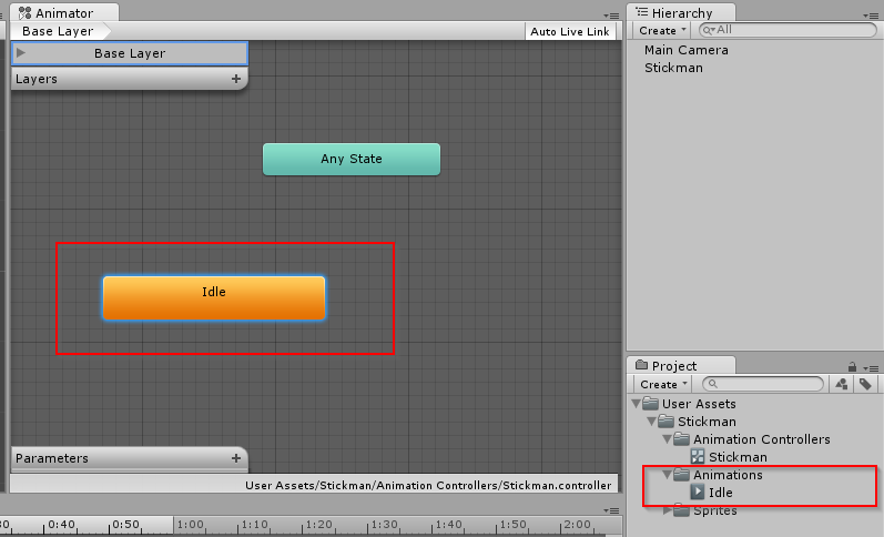 Kita beri nama clip tersebut, misalkan 'idle'. Clip idle ini saya simpan di 'User assets/stickman/animations/Idle'. Ketika animasi idle dibuat secara otomatis state baru bernama 'Idle' juga terbentuk di animator.