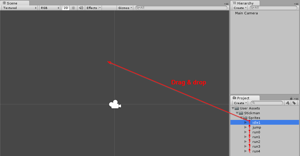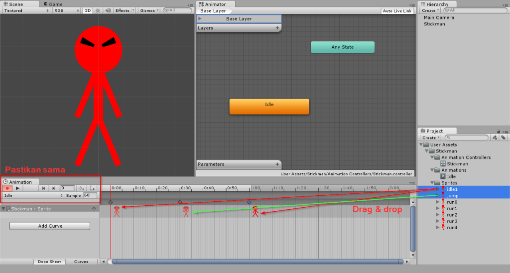 Langkah selanjutnya adalah meletakkan sprite di scene. Lakukan drag & drop sprite idle ke window scene.