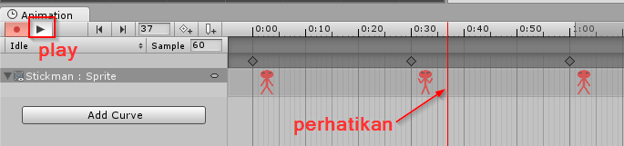 Kemudian sobat dapat mencoba memainkan sprite dengan mengklik play pada window animation. kita lihat animasi akan berjalan.