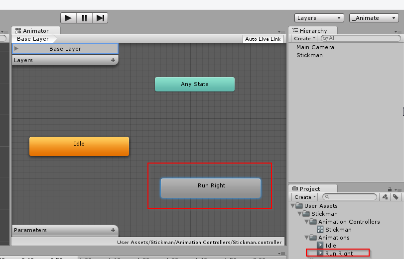 Kemudian kita simpan animasinya seperti sebelumnya. Lihat di window animator maka akan muncul state 'Run Right'