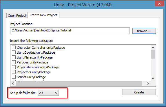 Seperti biasa, file >> new project. Namun perbedaannya pada pengembangan game 2D kita pilih 2D pada bagian 'Setup defaults for'.