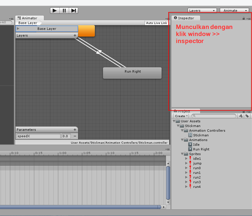 Animasi 'Run Right' akan dimainkan ketika kita menekan panah kanan. Karakter stickman akan memainkan animasi run right ini dan akan berlari ke kanan. Seperti biasa kita buat animasi baru, klik pada window animation >> Create new clip