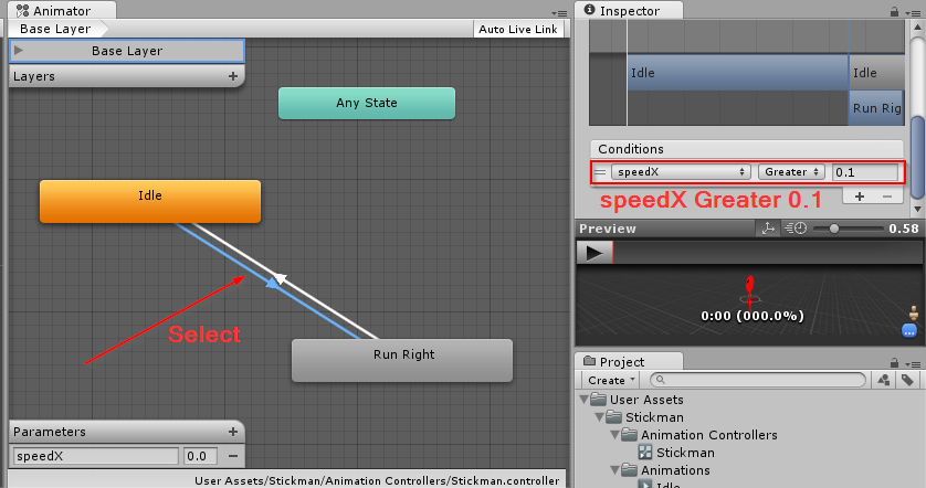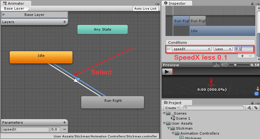 Lakukan hal serupa untuk transisi run right ke idle. Kali ini dengan pengaturan 'speedX Less 0.1'. Hal ini berarti animasi run right akan berpindah ke idle jika nilai speedX kurang dari 0.1