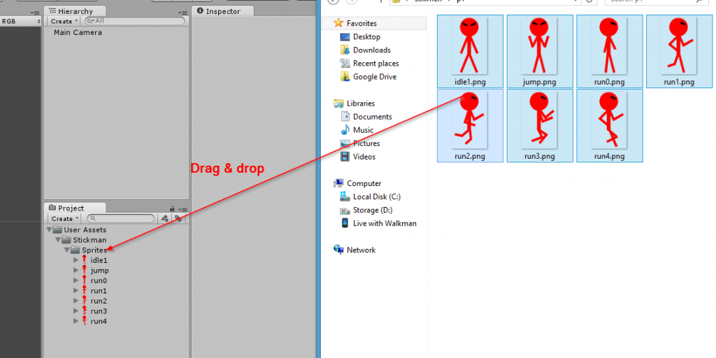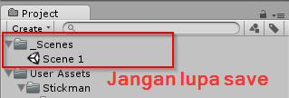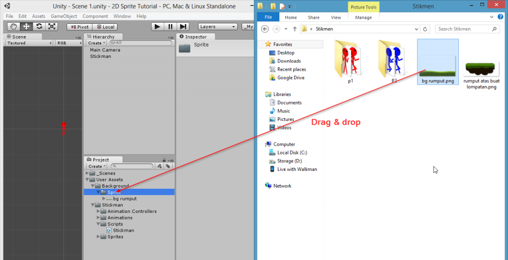 Kemudian kita import dengan melakukan drag & drop. Disini sprite saya import pada direktori 'User Assets/Stickman/Sprite'. Sobat dapat membuat sendiri direktorinya.