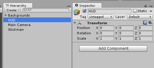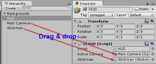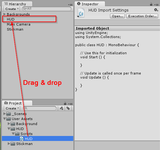 Buat script HUD.cs dan letakkan ke dalam object HUD dengan cara drag & drop