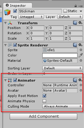 Setelah memberikan component animator maka seharusnya animator ada di dalam sprite. Klik sprite 'stickman' kemudian lihat di bagian inspector.